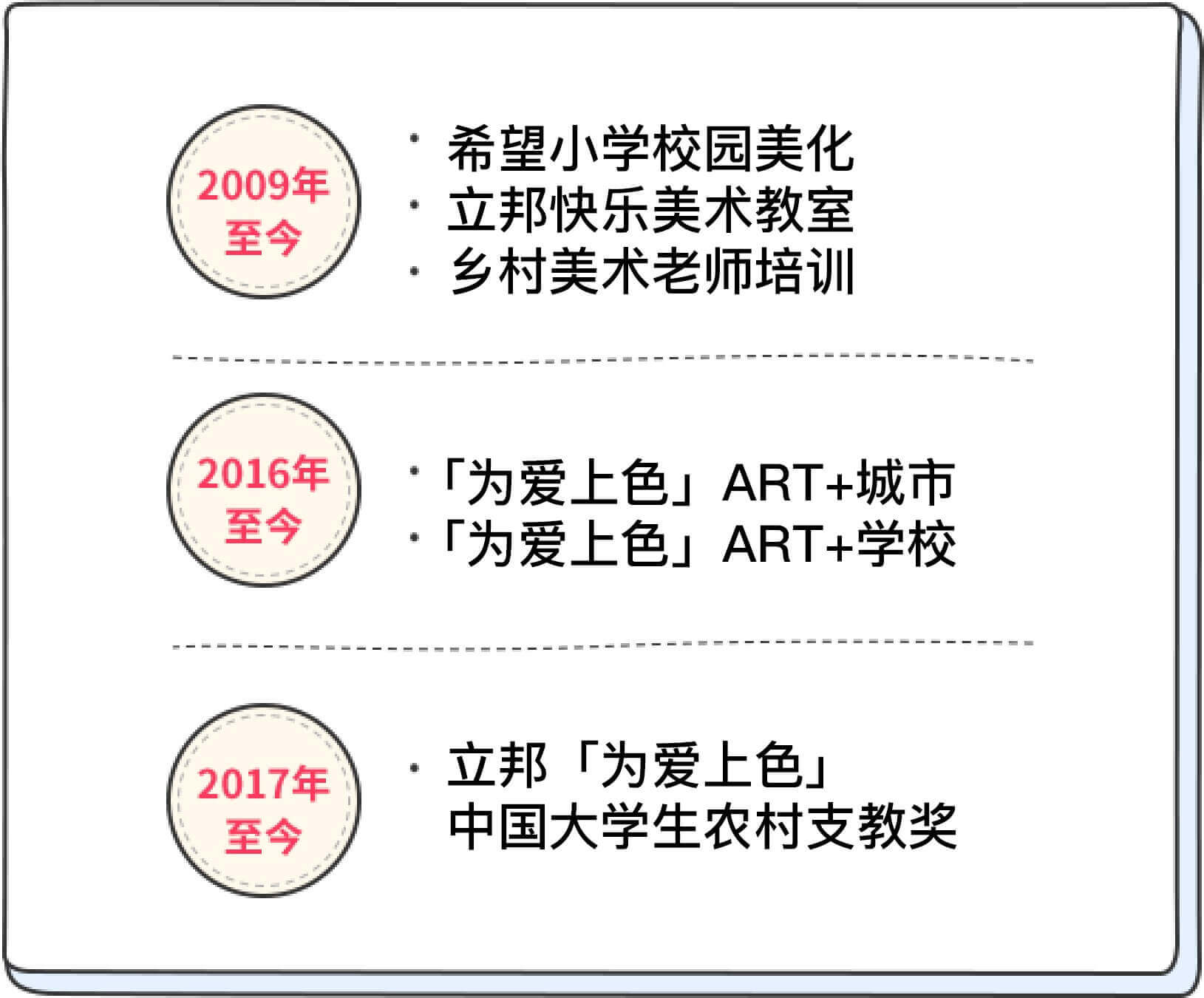 2017年,立邦中國加入共青團中央學校部指導下發(fā)起的“中國大學生知行促進計劃”,響應建設“美麗中國”號召,結合“一帶一路”和“精準扶貧”政策 ,開展“立邦「為愛上色」中國大學生農村支教獎”,鼓勵全國高校大學生深入鄉(xiāng)村,開展助學支教、傳統(tǒng)村落建筑及文化遺產調研等實踐活動。