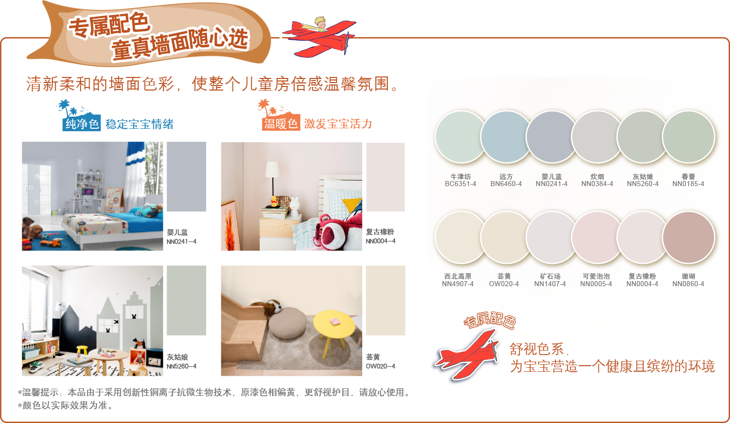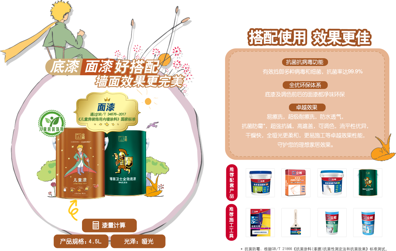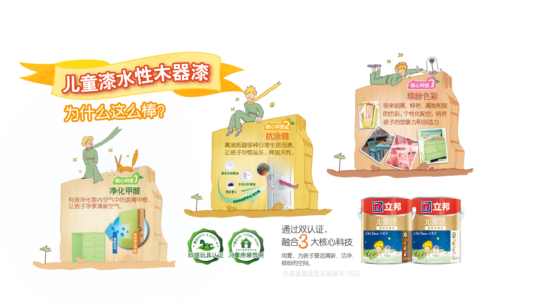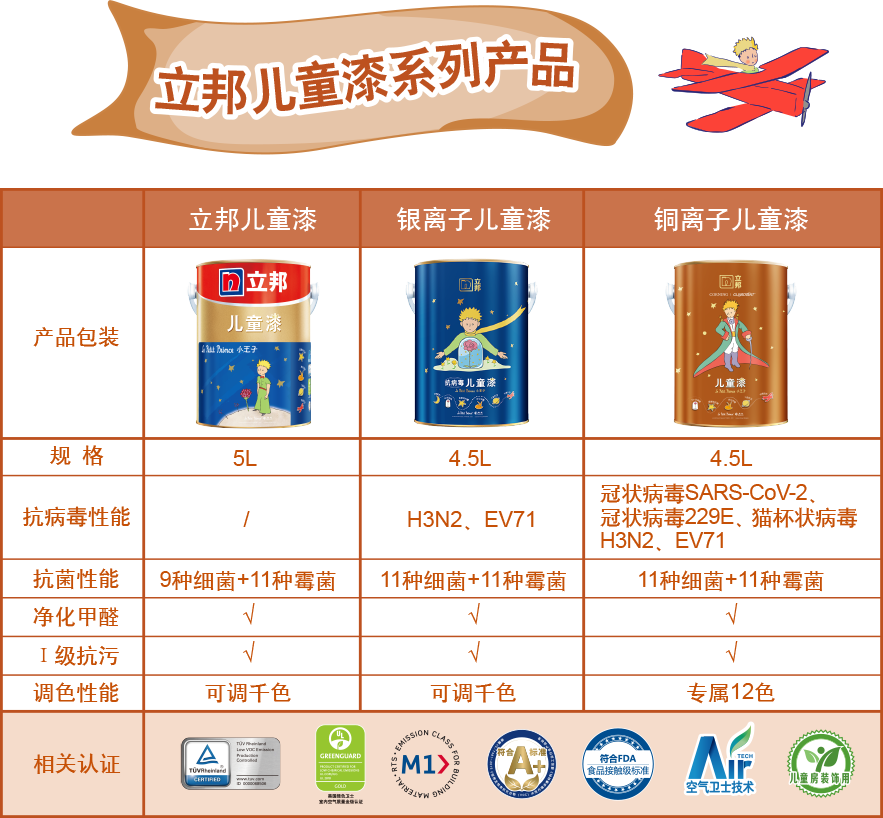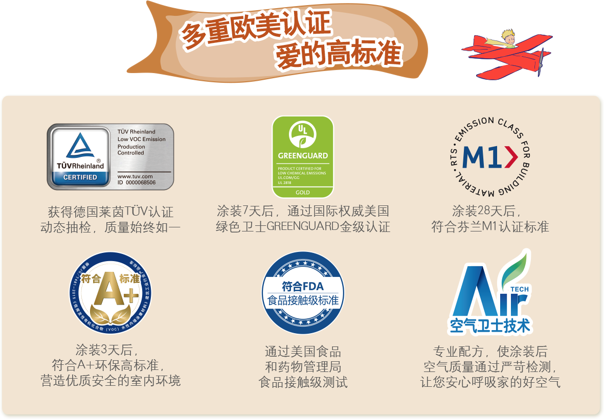 通過《歐盟玩具EN71-3》、《歐盟玩具 EN71-9》認證、GB/T 33394-2016《兒童房裝飾用水性木器涂料》國家標準。